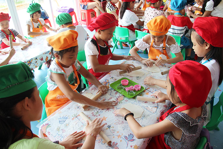 After lunch, the children traveled to the second camp site: Kiki kingdom. Kiki small kingdom located in Dapeng district, Dongshan Pearl Island, is a spot integrated with entertainment and education. The children are divided into three teams, experienced DIY handmade biscuits, magic school, Adams resistant passenger golf, children's short tennis, catching loach and other projects. In DIY handmade biscuits classroom, the children washed their hands, sit around, carefully listened to the teacher to explain how to make biscuits, wanted to experience the fun of handmade biscuit; in magic school, the clown's magic tricks amused the kids with laugh, children also learned a simple magic with clown; catching loaches is the most fun event for the boys, they caught a lot of them, some little girls caught some loaches too, but they only can take three small loaches as regulation in the park, the children hand over their loaches with honesty.
