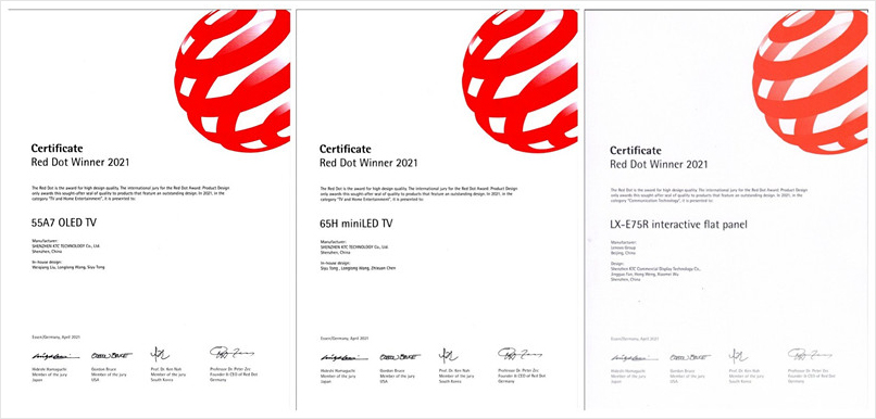 In March this year, the results of the 2021 German Red Dot Award were announced. Kangguan Technology Co., Ltd. (KTC) independently developed and designed 65H miniLED TV, 55A7 OLED TV and KTC commercial product LX-E75R interactive electronic whiteboard, which won the German Red Dot Design Award with the reputation of “Oscar for Design”. Recently, the company received a certificate of Red Dot Award issued by the organizer.
