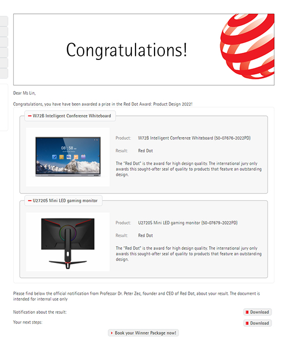Winners of the 2022 German Red Dot Design Award and iF Design Award were published one after the other. Good news came to KTC Technology consecutively. W72B smart conference whiteboard designed by KTC Technology, U2720S Mini LED electronic sports display won Red Dot Design Award. 43M31UKT smart fitness mirror won iF Design Award.