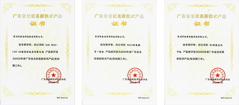 Recently, Guangdong High-tech Enterprise Association released the "2022 Guangdong Famous High-tech Products List". KTC Technology's "65H MINI-LED 4K Ultra HD LCD Smart TV", KTC Commercial Display Technology's "W61B Smart Education All-in-One Machine" and Horion Intelligent Technology's "M5 Smart Conference Tablet" were recognized as "Guangdong Famous High-tech Products" by virtue of their innovative strength, technical strength, and product strength.
