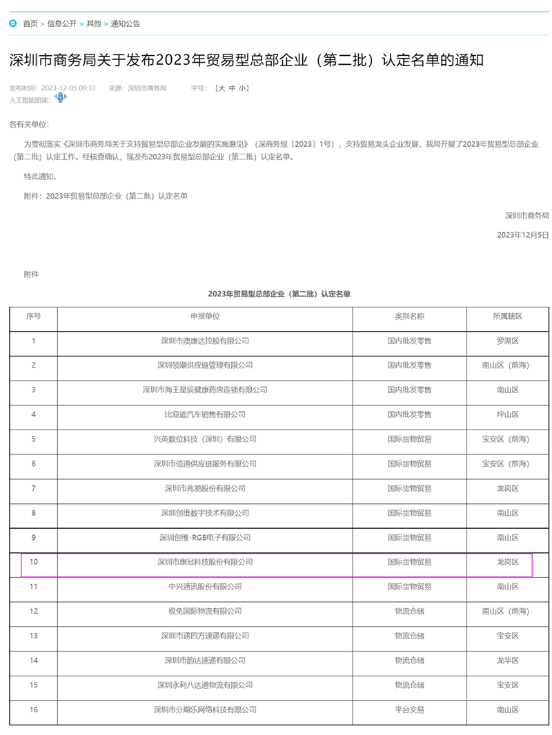 On December 5, the list of Shenzhen’s 2023 trade-oriented headquarters enterprises (second batch) was officially announced on the website of the Commerce Bureau of Shenzhen Municipality. KTC Technology was selected as Shenzhen Trade-oriented Headquarters Enterprise.