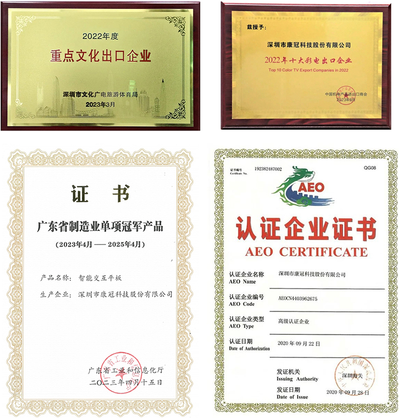 KTC Technology has achieved recognition through various accolades, including being honored as a "Specialized and Sophisticated Small Giant That Produces New and Unique Products", a "China Customs Advanced Certification Enterprise", a "Guangdong Province Manufacturing Single Champion Product Enterprise", a "Shenzhen Headquarters Enterprise”, a "Shenzhen Key Cultural Export Enterprise”, and one of the "Top Ten Import and Export Enterprises in Longgang District”. Additionally, the company has been acknowledged as one of the "Top Ten Color TV Export Enterprises”, among other notable titles.