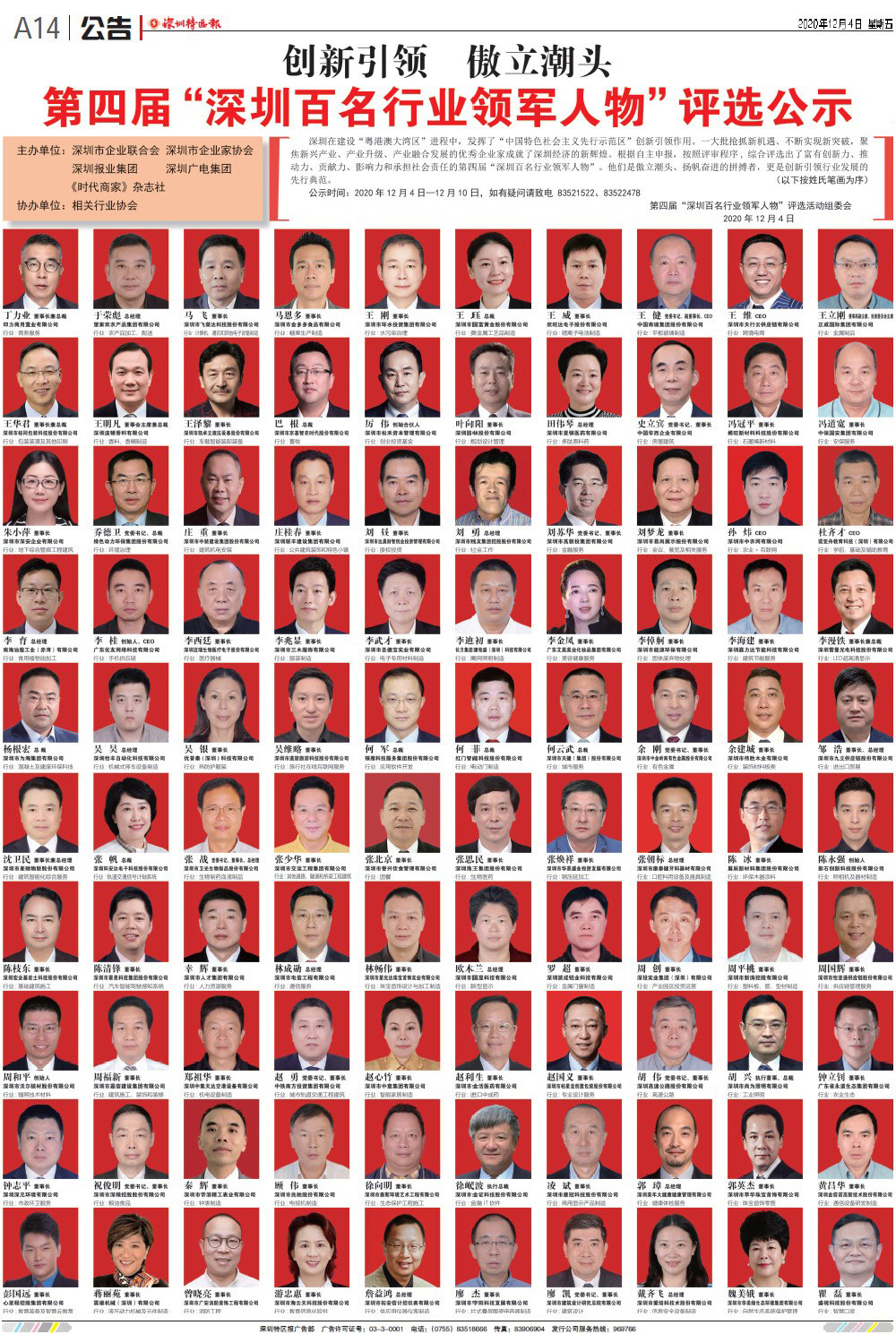Con el fin de enfocar en las figuras líderes de industrias y descubrir el espíritu de lucha de los empresarios en la nueva era, la Confederación Empresarial de Shenzhen, la Asociación de Empresarios de Shenzhen, junto con las asociaciones de industrias relevantes y medios de comunicación autorizados, organizaron la IV selección de "100 figuras líderes de industrias de Shenzhen".