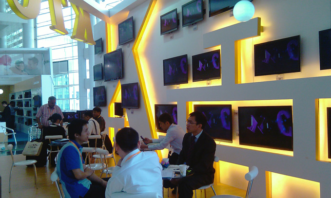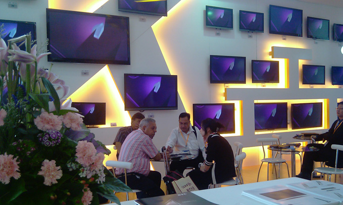 每届中国香港电子展的展区布置,公司都集思广益,力图给客户留下良好的第一印象,本届展会亦然。公司的展位装修别出心裁,风格新颖独特,挂墙的三排3D电视,气势逼人,在所有展位中堪称效果最佳,吸引往来客户的眼球,很多国内外客户驻足在公司展区,尤其是专业客户和欧美客户,比往年更多。
