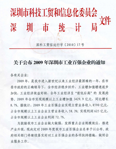 3月11日,深圳市科工贸信息委和市统计局联合公布了2009年工业百强企业榜单,我司荣誉上榜,位居57位。 09年,全球金融危机,给全球经济带来重创,我司及时调整产品规划,重新制定市场战略,实现逆势增长,同比08年,销售收入增长58%,产能增加近一倍,为2010年公司的发展奠定了良好基础。
