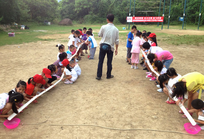 组队之后,小朋友们开始了能量传输、有轨电车及横向螃蟹等项目的竞赛。能量传输是一个团队竞争项目,两个队伍要利用PC管将球接力运送到终点的桶内。通过这个游戏,小朋友们体会到团队的明确分工和良好协作是完成任务的关键,并且加深了对“相互帮助”的理解。有轨电车是小组队员全部站在木板上、齐心协力以共同步伐前进,它能够锻炼小朋友们的纪律性,培养小朋友们永不放弃的精神。而横向螃蟹则是要求队员们通过有效沟通来及时解决问题,在这个游戏里面,只有统一步伐、相互鼓励、减少埋怨,才能齐心协力,取得领先。