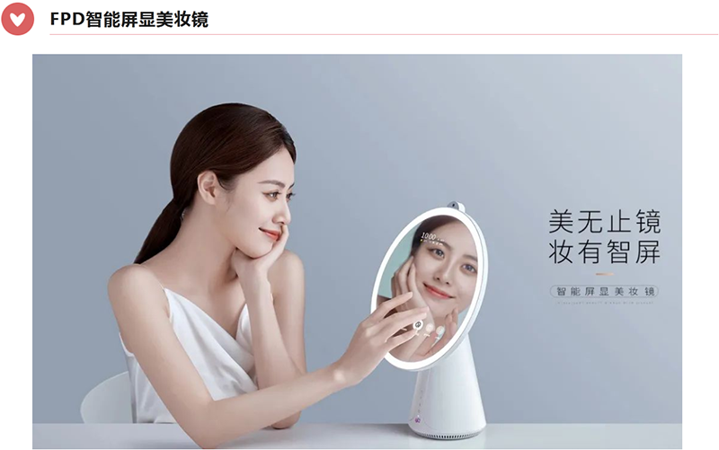 FPD智能屏显美妆镜集镜面与触摸屏、灯光条、摄像头、音响等于一体的智能美妆产品,采用了人脸识别功能,以多场景光线模拟并实现人脸上妆、换发型、换装饰等功能,还原细节,还原真实,为体验者带来真实的美妆场景,造型简约时尚,是适宜家用、赠礼的智能家居精品。